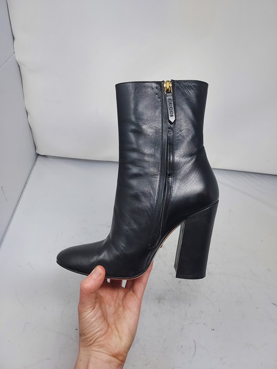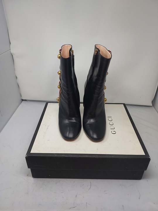 All black soft leather ankle bootie with blue/red/blue web detail and subtle gold trim