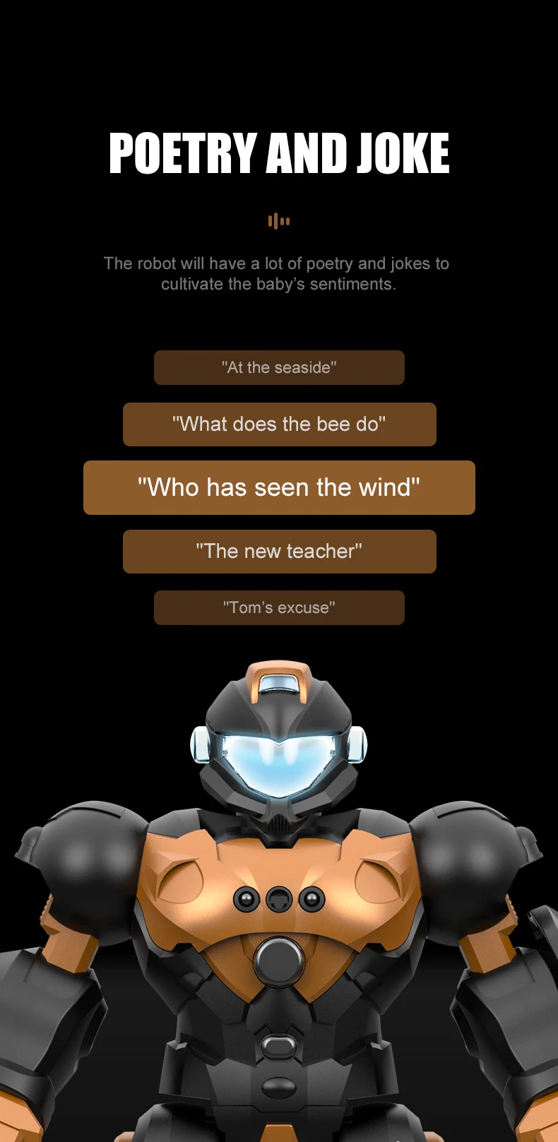 3.10 large voice modules, 20 groups of voice dialogue content and voice control dance function.